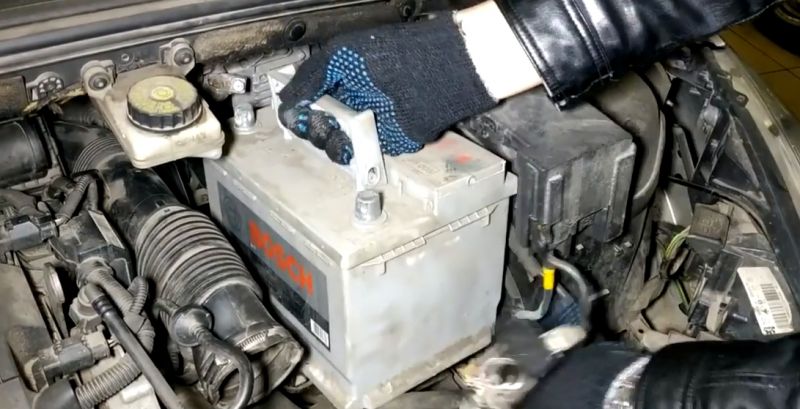 Открутите гайку крепления минусовой клеммы и снимите аккумулятор. Гайка под головку на десять.