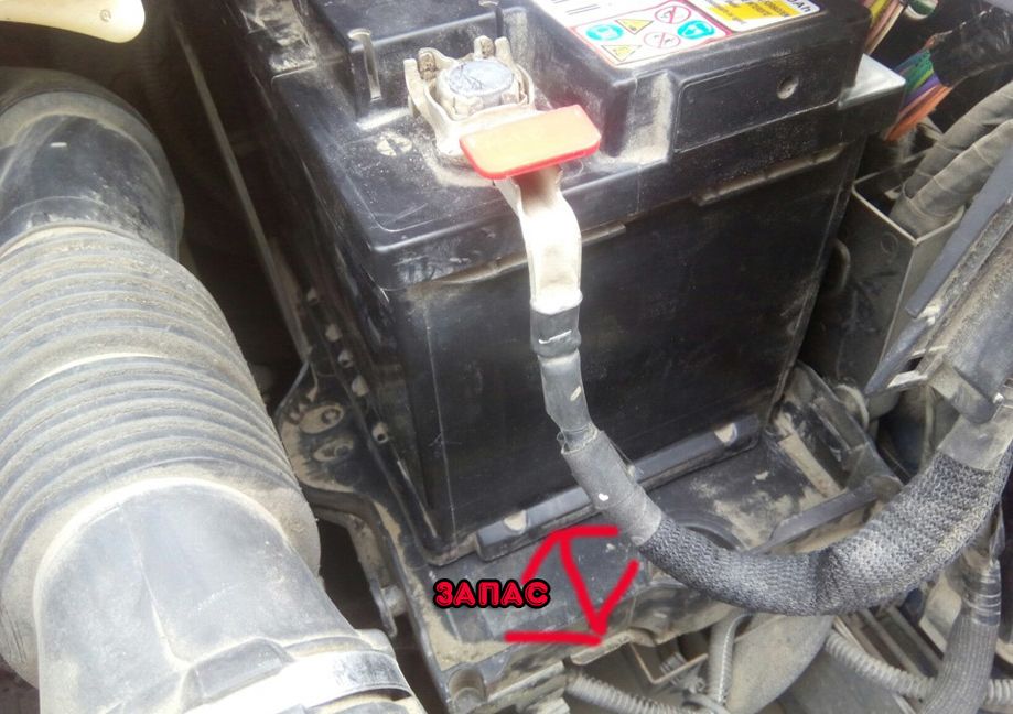 Снимите пластиковую крышку и отсоедините плюсовую клемму. Для того чтобы отсоединить клемму, нужно поднять вверх ниже отмеченный пружинный фиксатор.