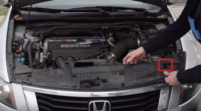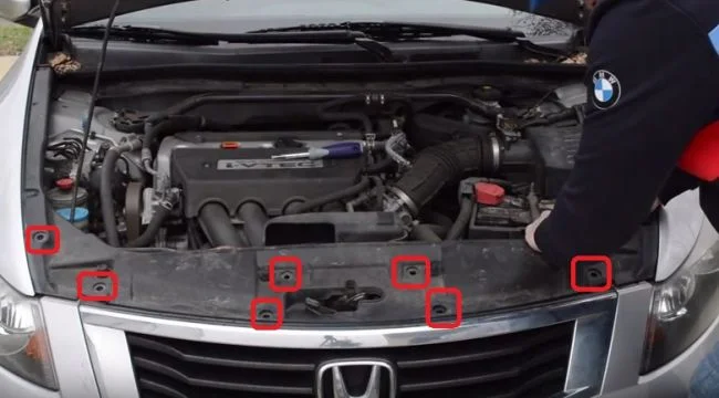 Разборку начинаем со снятия пластиковой крышки над радиатором. Для этого в указанных местах вытаскиваем клипсы. Поддеваем их отвёрткой.