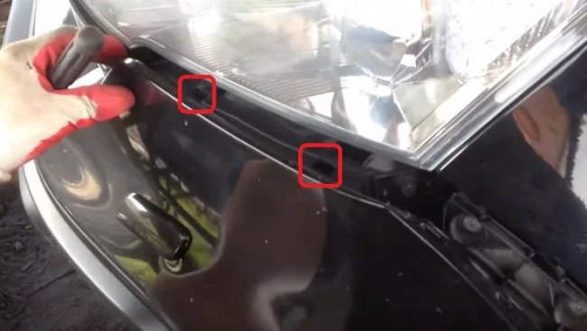 Также отжимаем два крепления под фарой. Повторяем снятие для другой стороны.