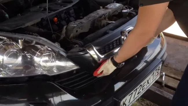 Берёмся за край бампера, оттягиваем немного вниз.