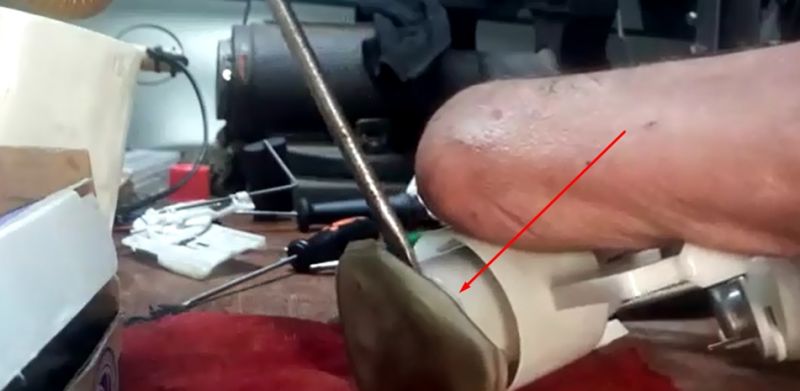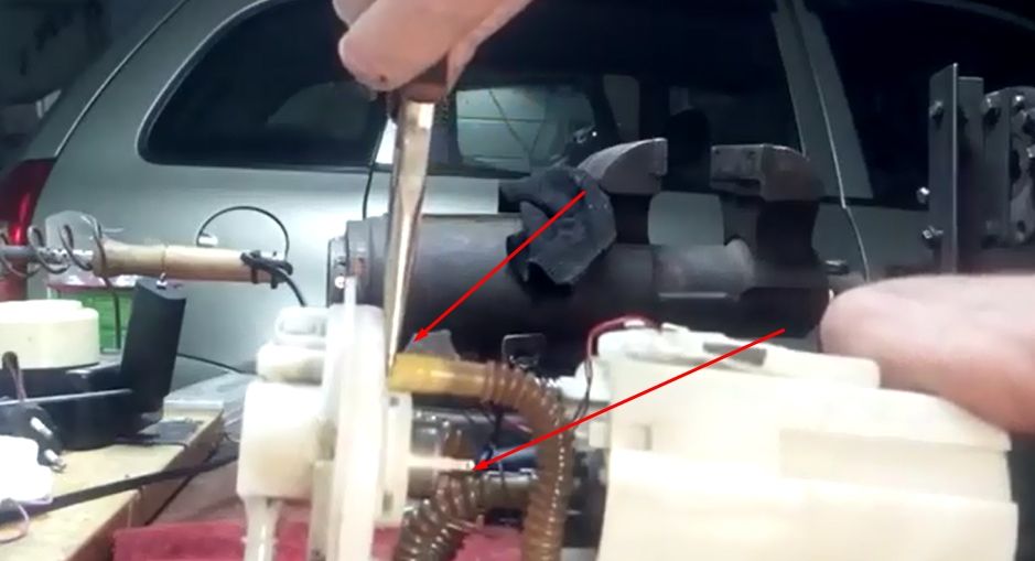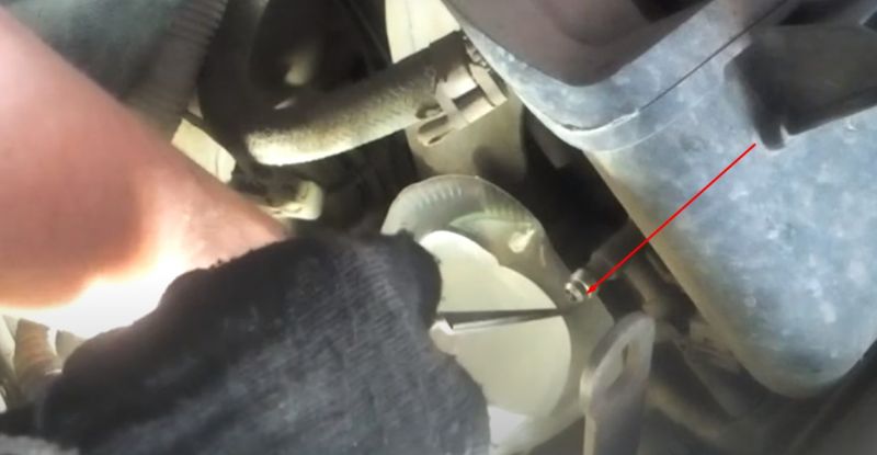 Снимите ниже отмеченный разъем и шланг с помощью узкогубцев.