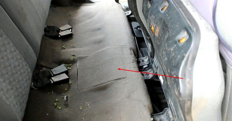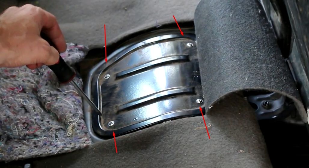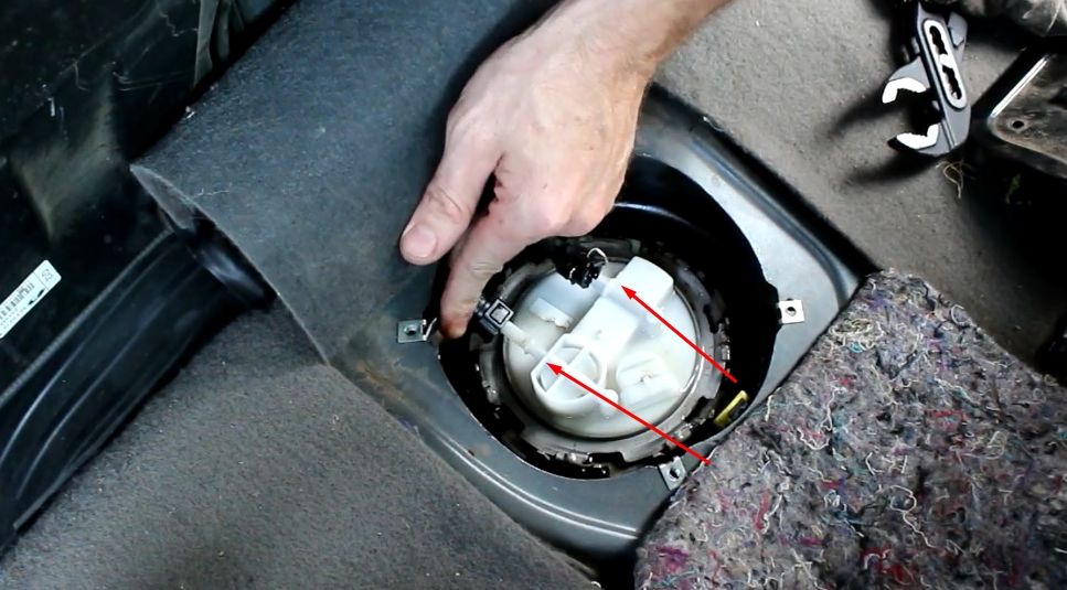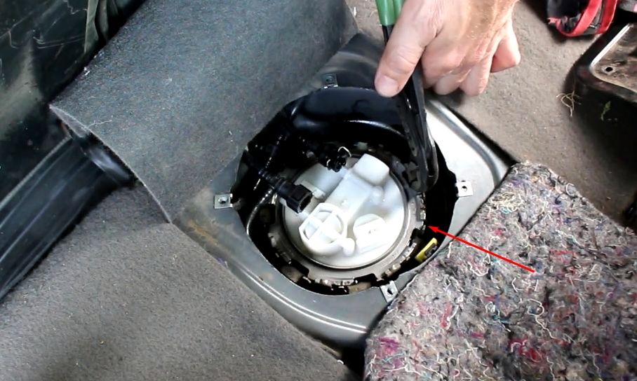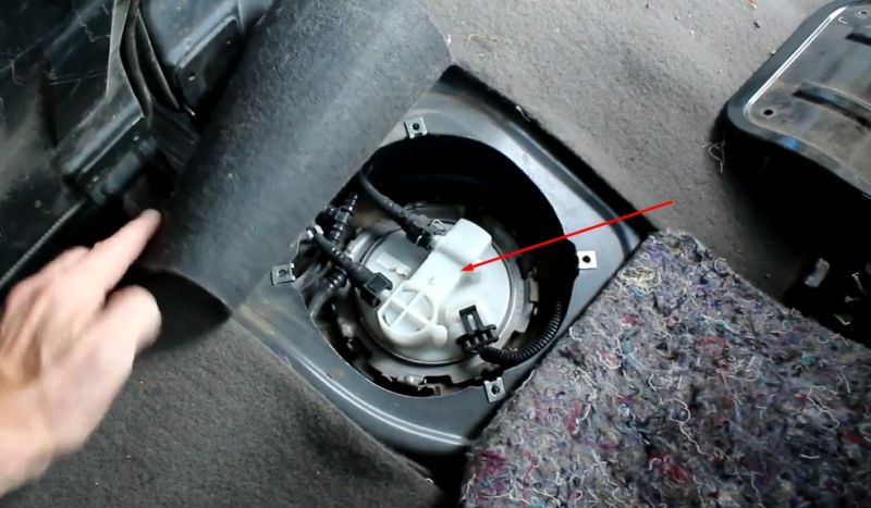 Откиньте нижнюю подушку заднего сидения и откройте лючок в шумоизоляция для доступа к топливному модулю.