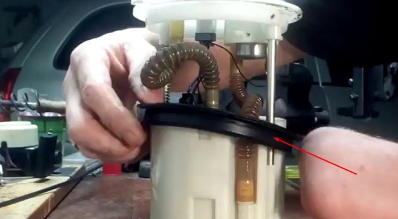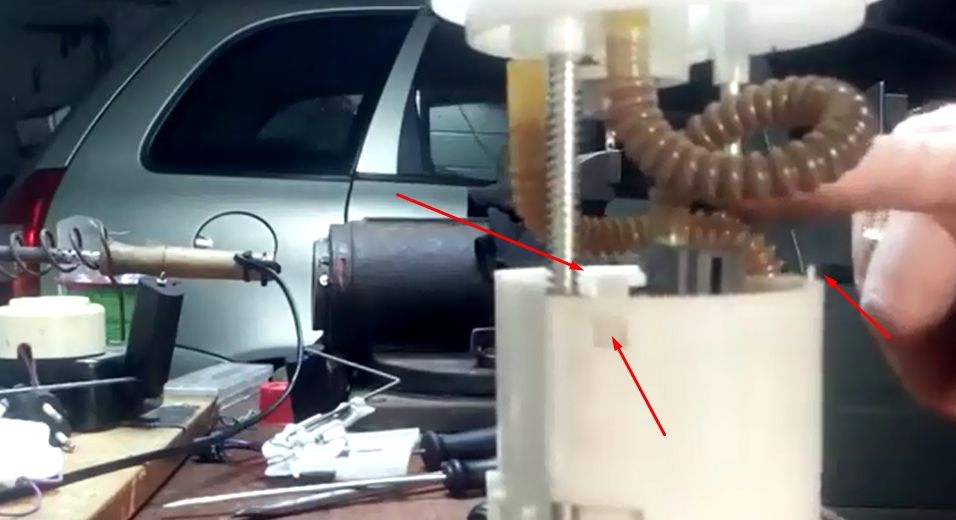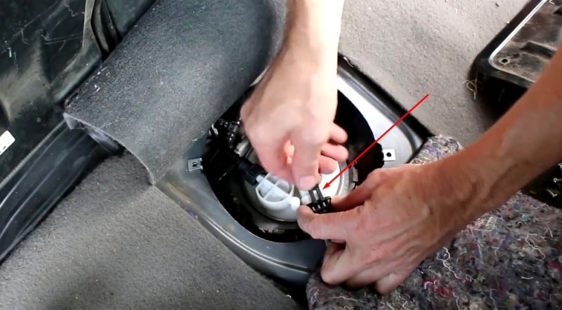 Сожмите три пластиковых фиксатора и снимите бензонасос вместе с крышкой.