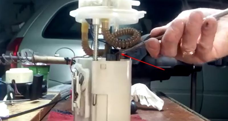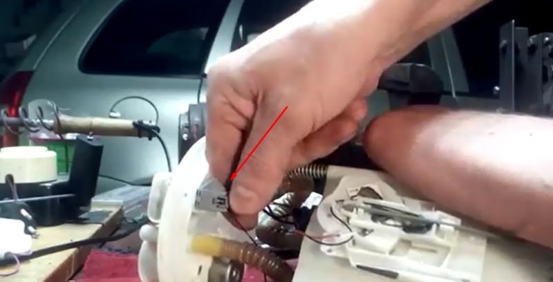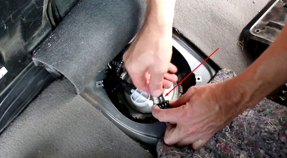 Подденьте шлицевой отверткой и выведите вниз переходной разъем на топливный насос. Он фиксируется за счет бокового пластикового прилива который входит в отверстие на корпусе модуля.