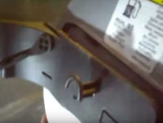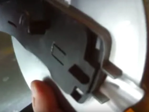 Затем отвёрткой поддеваем язычок фиксатора и одновременно тянем лючок в сторону от бака.