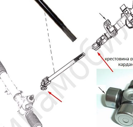Откручиваем болт под капотом возле рулевой рейки, потом болт под рулевой колонкой. Тянем вал в салон пока не выйдет карданчик из зацепления с рейкой. Потом тянем его вниз в моторный отсек.