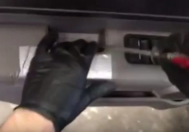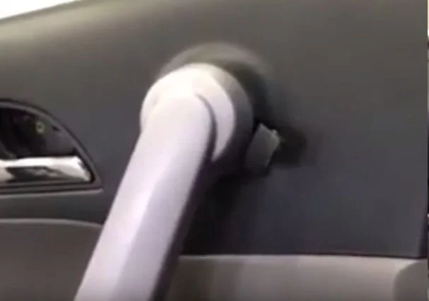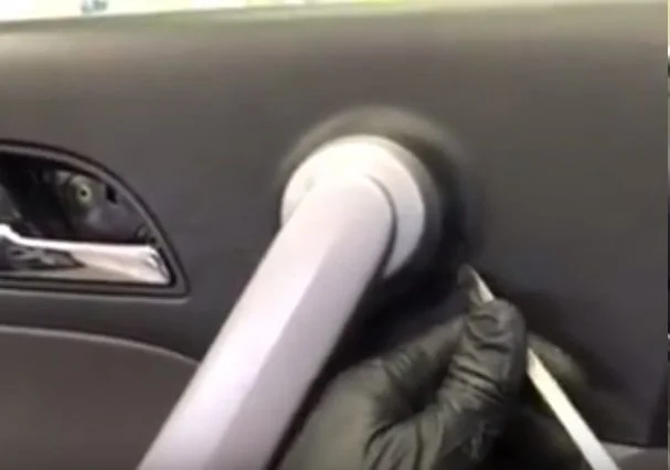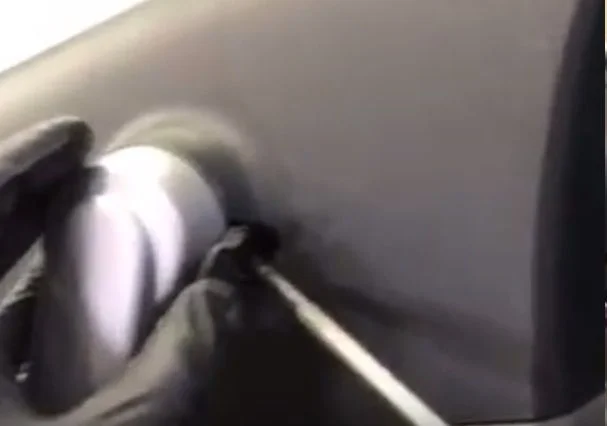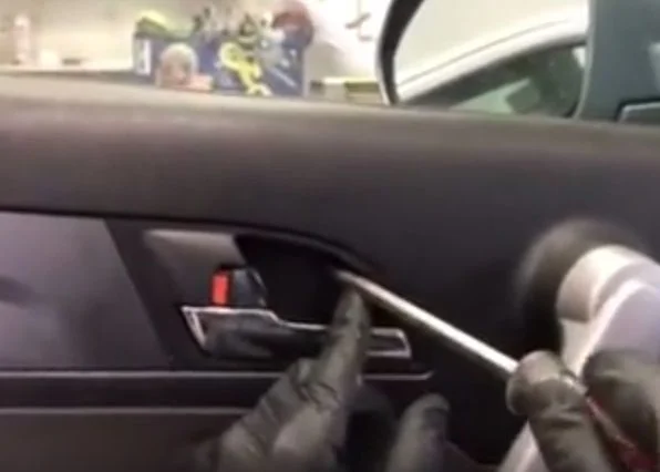 Следующим этапом в нише ручки открывания двери поддеваем декоративную накладку отвёрткой. Примерно в точке верхней защёлки.