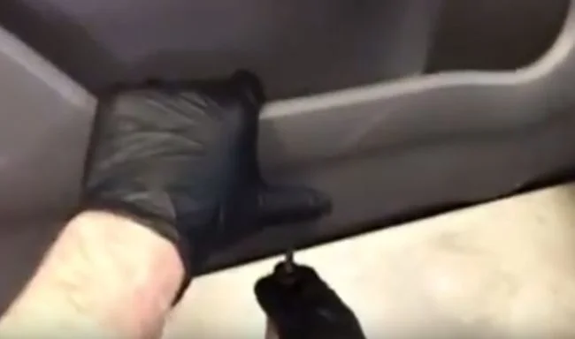 Одновременно захватываем обшивку за пластиковый карман. Дёргаем за карман и отжимаем отвёрткой как рычагом.