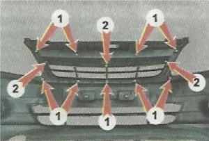6) отвинтить девять гаек, крепящих решетку радиатора к бамперу, и снять ее;