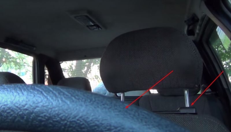 Для снятия заднего подголовника одной рукой сожмите на одной из штанг фиксатор. Далее другой рукой возьмитесь за подголовник и потяните его вверх. Как правило, снимается он достаточно легко. Ниже на фото отмечен фиксатор.