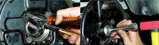 резко потянув за колесо, вынуть полуось, вместе с запорным кольцом и подшипником;