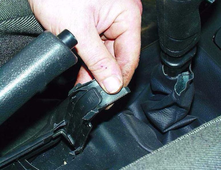 - также стоит снять облицовочную накладку под рычагом ручного тормоза (чтобы это сделать, необходимо воспользоваться плоской отверткой);