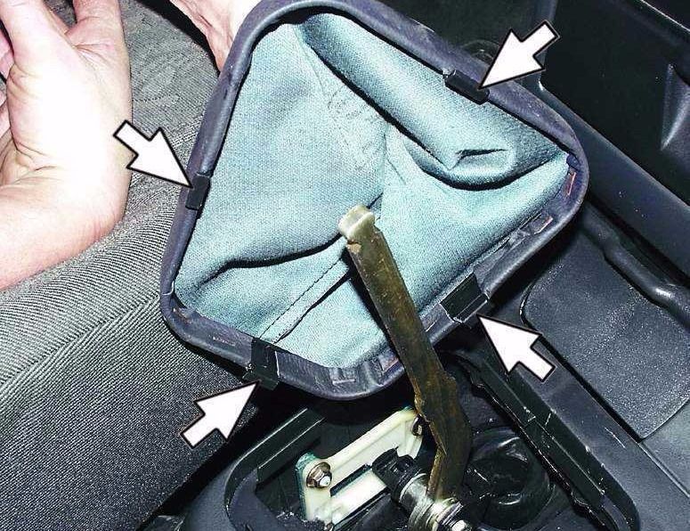 - как только снимите облицовочную накладку, следует демонтировать чехол рычага МКПП (его также можно с легкостью поддеть плоской отверткой);