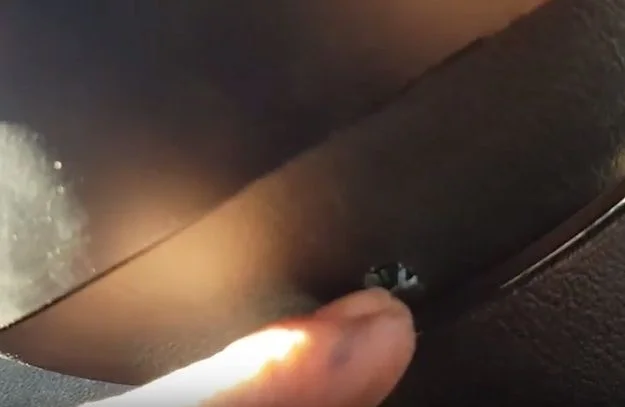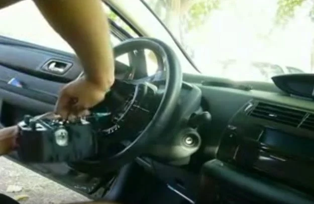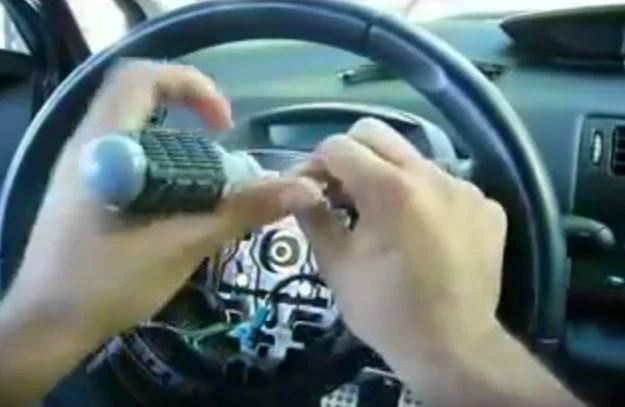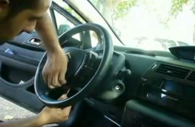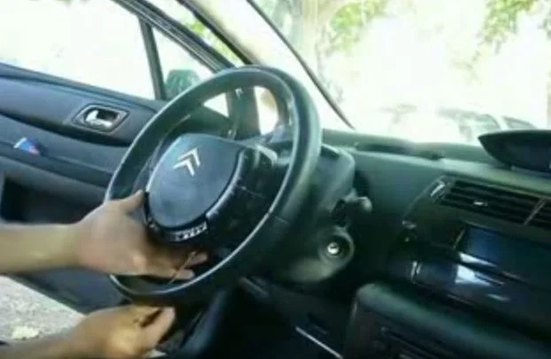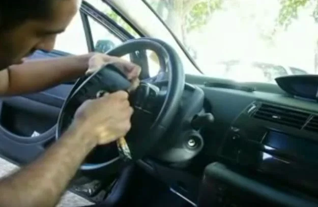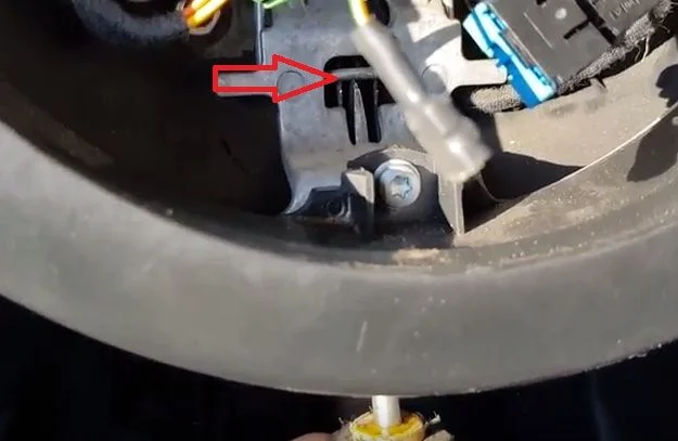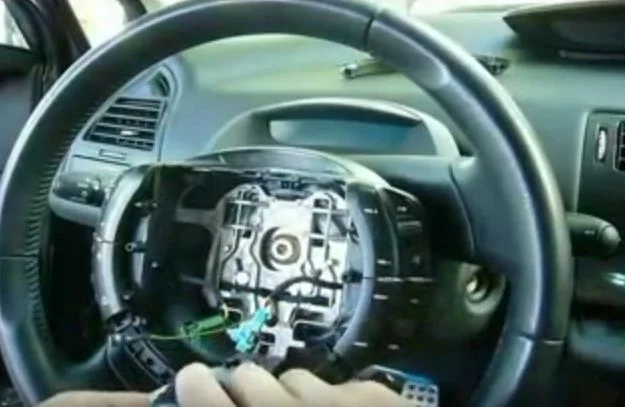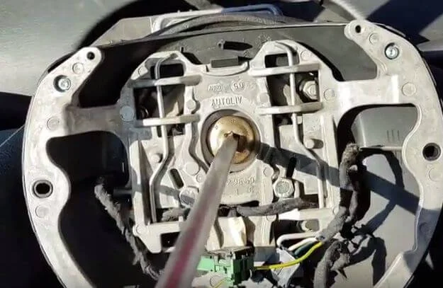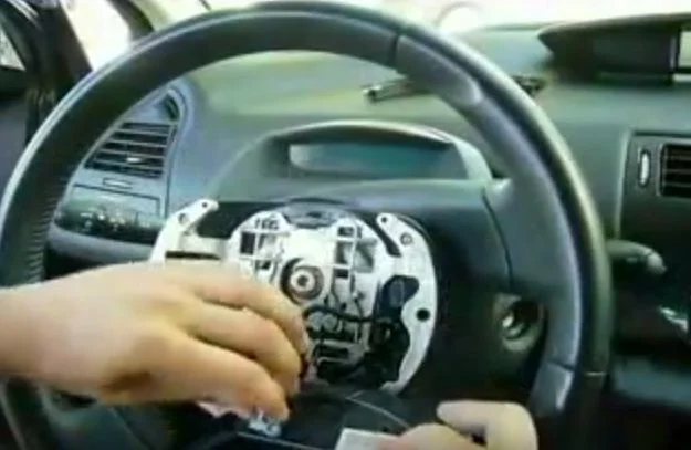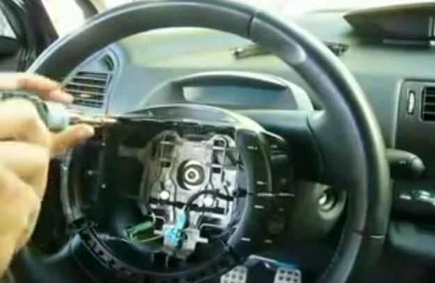 Прежде чем снимать руль надо отключить аккумулятор и выждать как минимум 10 минут. Затем выставляем колёса ровно(мануал рекомендует фиксировать колонку приспособлением) и снимаем корпус подушки. Для этого через прорезь в корпусе вставляем прочную плоскую отвёртку.