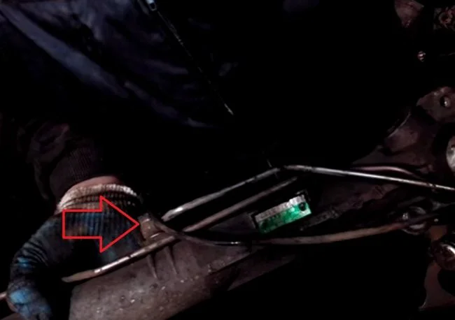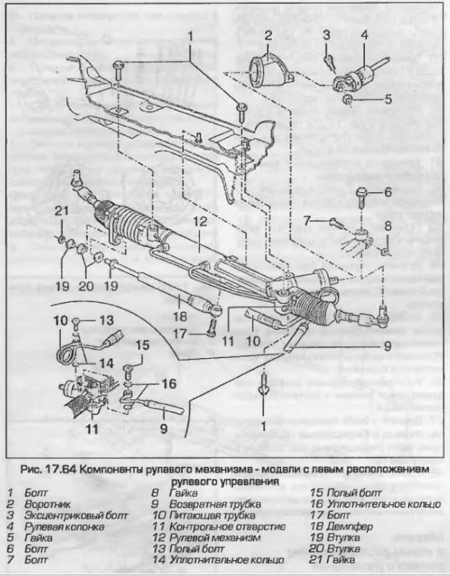Сливаем жидкость из бачка ГУР. Остатки жидкости сольются при отсоединении трубок(приготовьте ёмкость). Снимаем часть локера для доступа к поворотным кулакам. Наносим метки для сборки и снимаем трубки. Уплотнительные шайбы выбрасываем, для установки нужны новые. Отсоединяем наконечники от поворотных кулаков. Отворачиваем болты(1) крепления рейки к кузову. Левый болт под тормозным цилиндром.