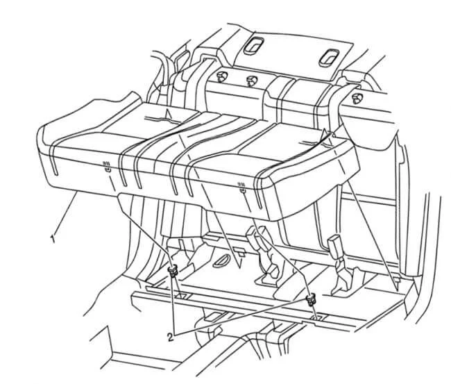 Теперь нужно открутить гайки(1) и снять замки ремней безопасности(2).