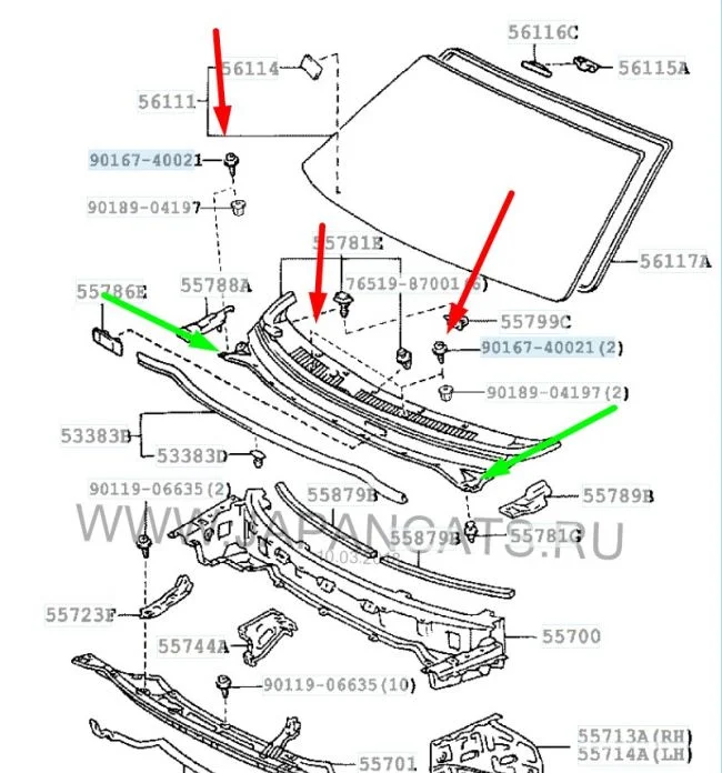 По каталогу там есть два или три винта (указал красной стрелкой) и две клипсы (зеленой стрелкой).