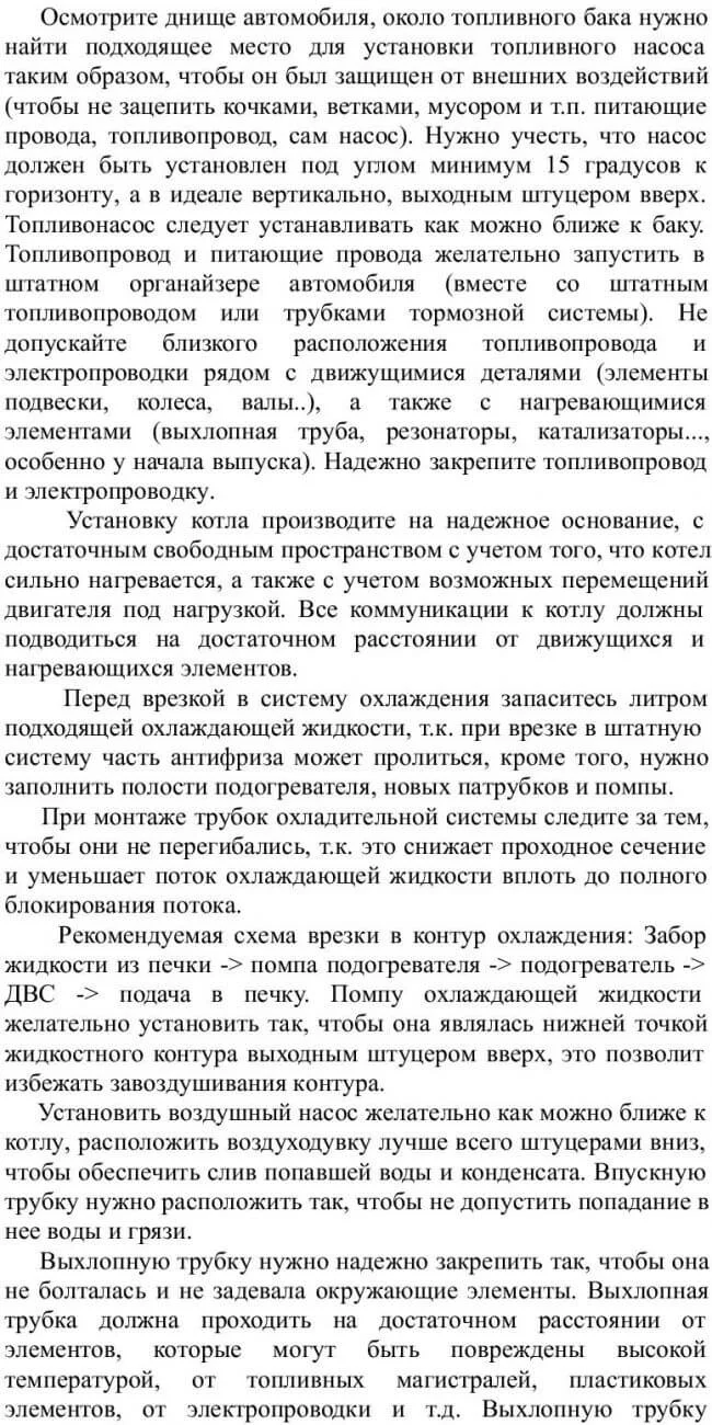Установите котел на надежное основание: вокруг него должно быть достаточно свободного пространства. Все коммуникации к котлу должны быть на расстоянии от движущихся элементов.Перед врезкой в систему охлаждения запаситесь литром охлаждающей жидкости, поскольку при врезке в штатную систему часть антифриза может пролиться. Во время установки трубок охладительной системы следите за тем, чтобы эти трубки не перегибались, поскольку это значительно уменьшает проходное сечение и поток циркулирующей охлаждающей жидкости (это может стать причиной полной блокировки потока).