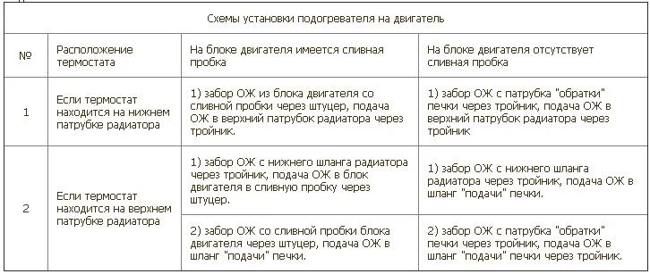 Схема врезки должна выглядеть примерно так: забор жидкости из печки – помпа предпускового подогревателя – подогреватель – двигатель – подача в печку. Помпу нужно установить так, чтобы она оказалась нижней точкой жидкостного контура (штуцер обращен должен быть вверх: это даст возможность избежать завоздушивания контура).