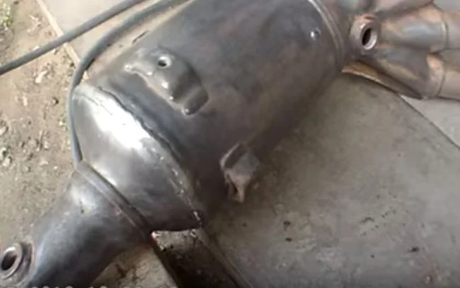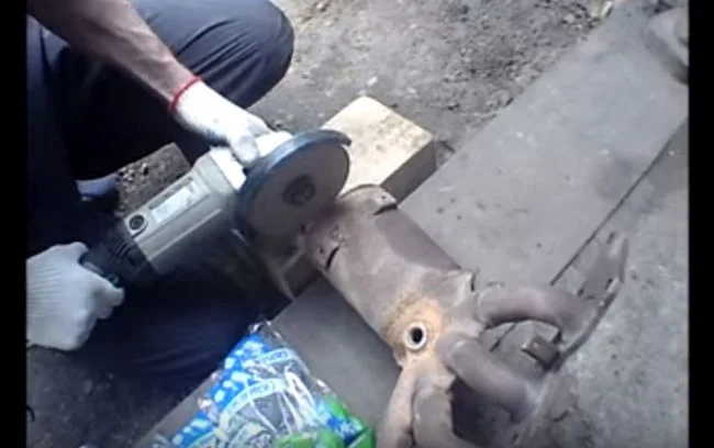 Наиболее доступный способ выбить катализатор, в гаражных условиях, это вырезать окно болгаркой и затем его заварить. Если же сам корпус катализатора разрезать на части, то проблемой будет точно его затем сварить. Впрочем это тоже возможно. Для этого делаем предварительно несколько насечек в месте где будем разрезать корпус.