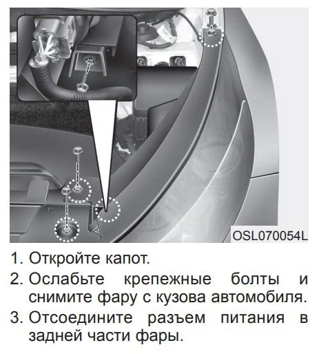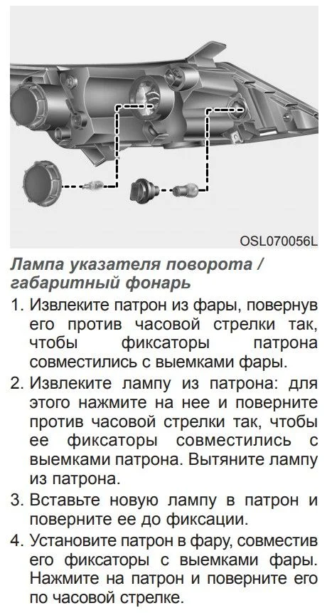 Вот выдержка из руководства (передний габарит), а тут показано в картинках (попробуйте сначала на не снятой фаре).