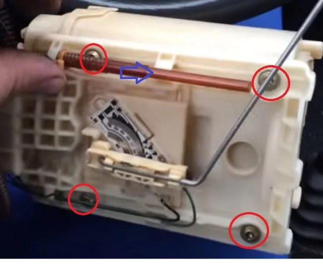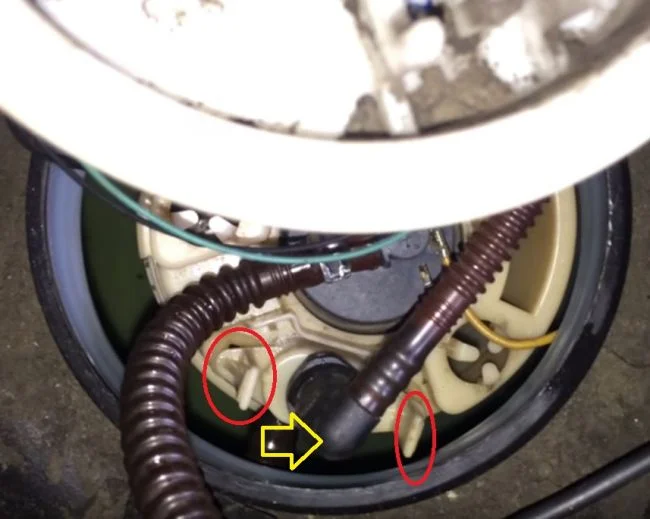 Корпус модуля бензонасоса крепится пластиковой круглой гайкой. Её надо повернуть против часовой стрелки что бы вывести из зацепления. Если будете проворачивать без специнструмента то выбирайте тупой инструмент, что бы не срезать выступы.
