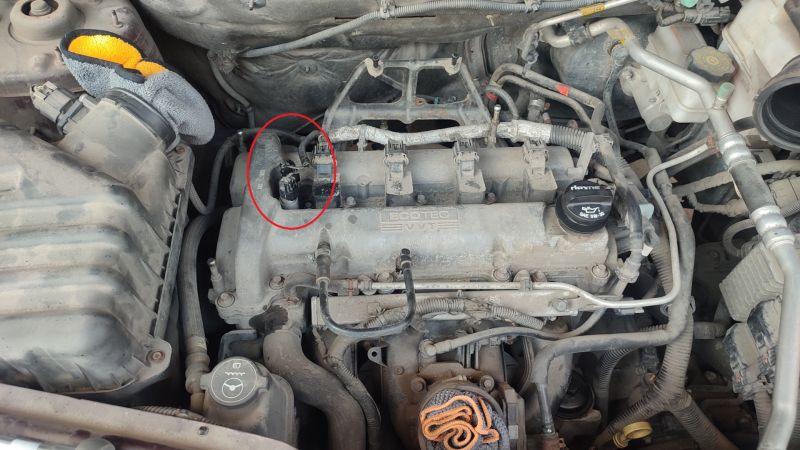 На фото указал, где установлен датчик. Достаточно отщелкнуть разъем датчика и открутить один болт крепления. Желательно менять сразу два датчика.