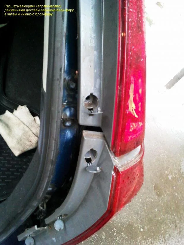 Стоп-сигнал находится в нижней блок-фаре. Для ее снятия нужно снять верхнюю. Выкручиваете 2 самореза в верхней и 3 самореза в нижней фаре, которые под заглушками, а фару тяните на себя. Блок-фары там держатся, помимо саморезов, на пистонах.