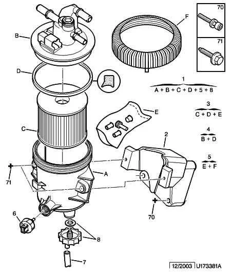 Снимаем шланги со штуцеров и разъем подогрева с крышки(В), откручиваем гайку(F), вынимаем(F, B, D) и сам фильтрующий элемент©, меняем его на новый и собираем в обратном порядке. См. схему.