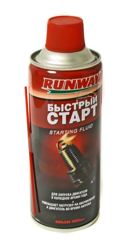 В баллончике, это эфир, он легко воспламеняем, потому и облегчает запуск двигателя.