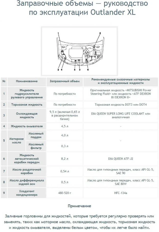Вот полный список здесь Объёмы и рекомендуемая смазка на Mitsubishi Outlander XL…
