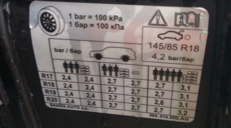 На Шкоде Кодиак на внутренней стороне лючка бензобака есть четкое обозначение, какое должно быть давление в шинах Шкода Кодиак. При этом для покрышек на дисках R17, R18, R19, а также R20.