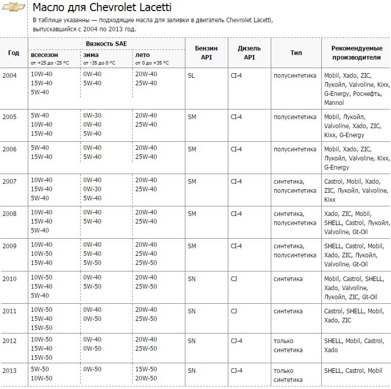Шевроле Лачетти, какое масло заливать в двигатель?