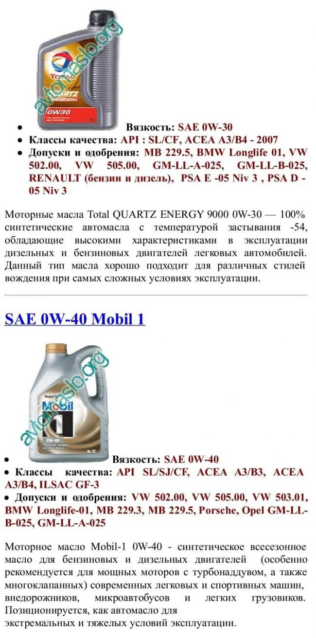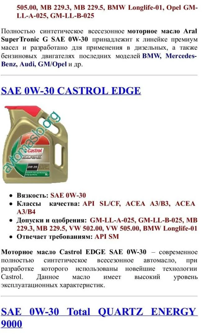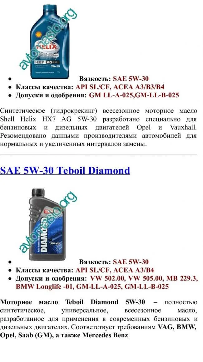 Список масел которые подходят под эту спецификацию.