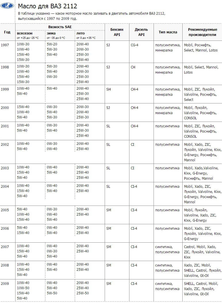 Выбрать то масло, которое наилучше подходит для ВАЗ 2112 поможет картинка вверху.