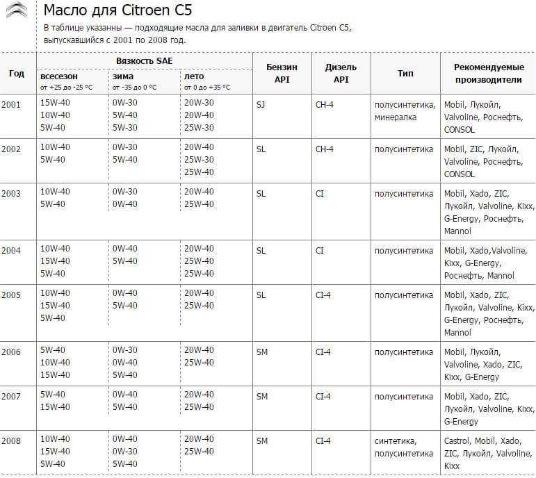 Таким образом можно выбрать подходящее смазку и замена масла в Ситроен С5 пройдет без проблем.