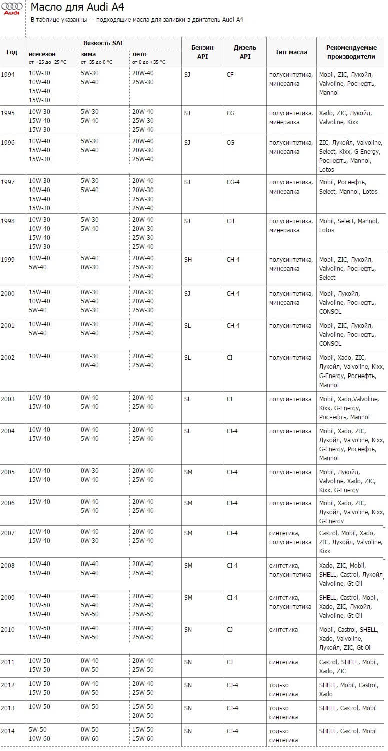 Выбрать подходящее моторное масло для Audi A4 поможет таблица вверху.