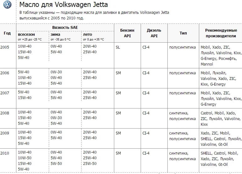 Выбрать подходящее для замены масло на Фольксваген Джетта можно с помощью таблицы вверху.