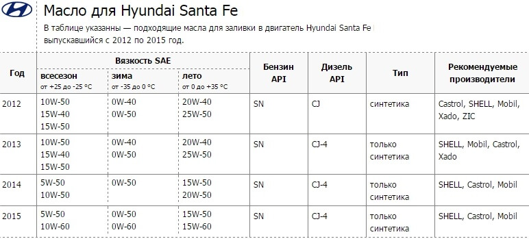Узнать какое масло лить в двигатель Санта Фе можно из руководства по экспулатации. Там, как правило, производитель авто указывает какое масло он считает оптимальным для данного движка. Данные в таблицы приближены к рекомендованным.
