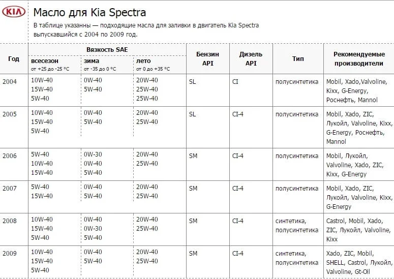 Какое масло лучше заливать в двигатель Киа Спектра должно быть указано в руководстве по эксплуатации. Там можно найти масло, которое производитель авто считает оптимальным. Данные в таблице приближены к рекомендованным в Киа.