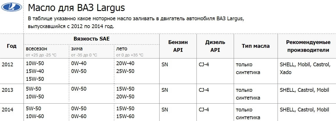 К примеру, на зиму для моделей Лада Ларгус 2014 года лучше выбрать синтетическое 0W-50/SN.