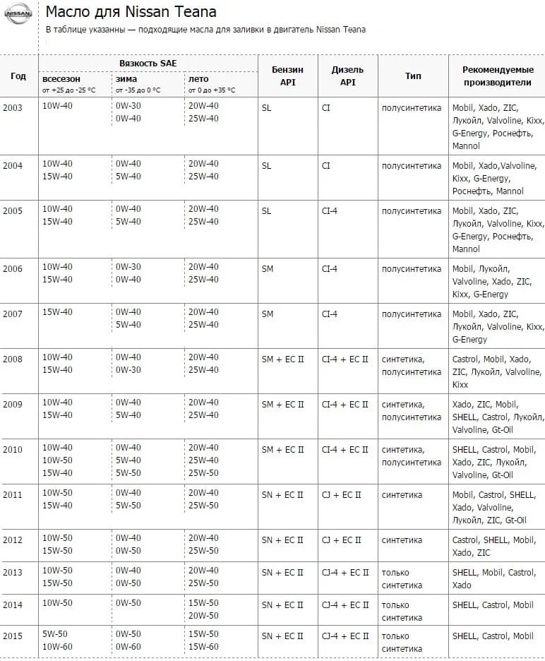Таблица позволит выбрать подходящее масло для двигателя Ниссан Теана. Данные приближены к тем, которые указывает производитель авто а руководстве по эксплуатации.
