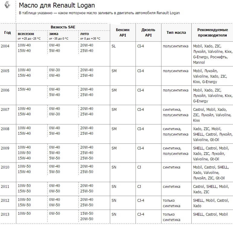 Выбрать подходящее масло для двигателя Рено Логан поможет таблица выше.