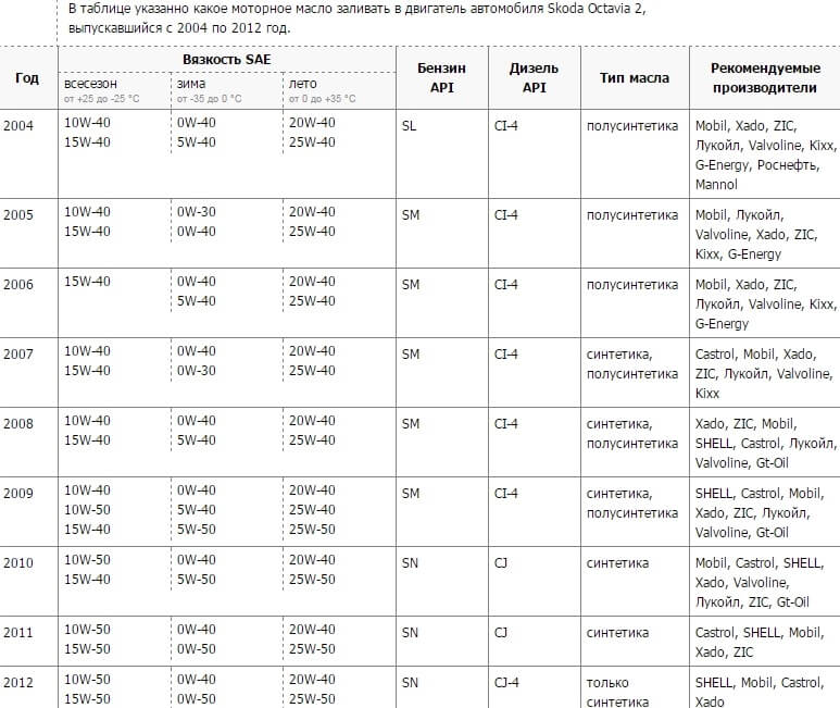К примеру, на лето для Skoda Octavia 2011 г.в. с дизельным двигателем лучше подобрать синтетическое масло вязкости 20W-40 или 25W-50 с качеством CJ.