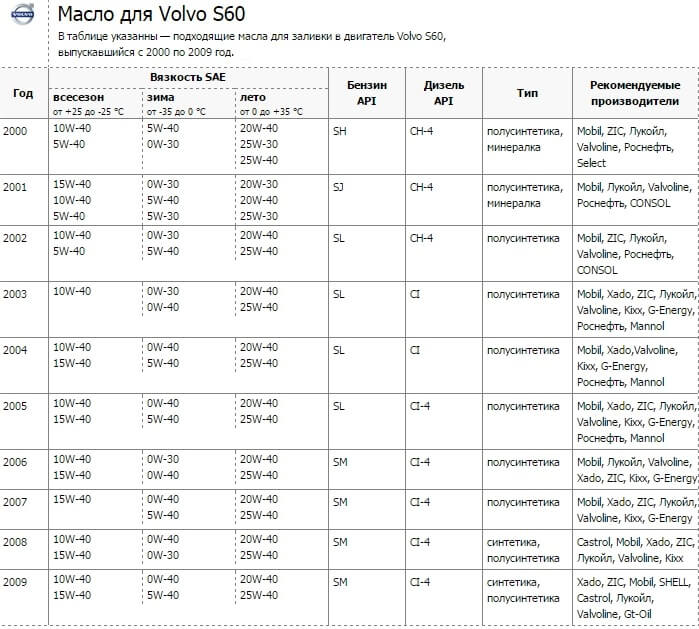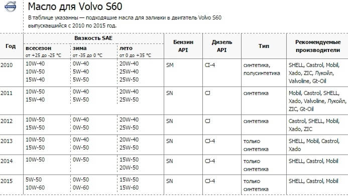 Руководствуясь этим, можно подобрать нужное масло для замены в двигателе Вольво S60.