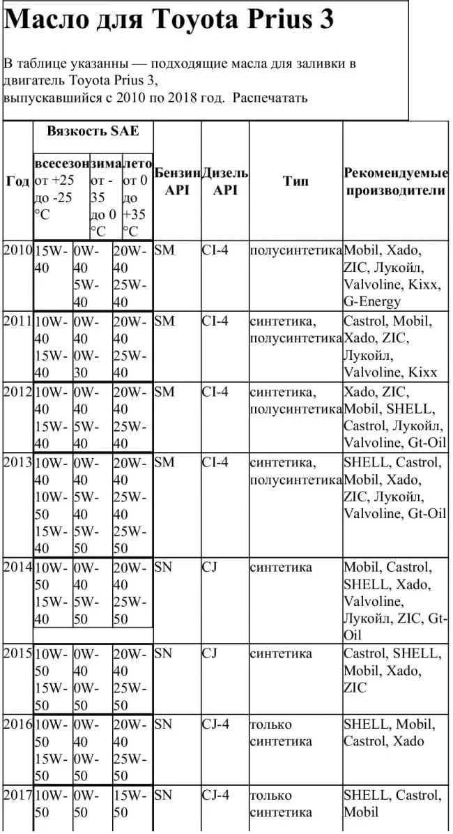 Вот вам таблица выбирайте масло для Toyota Prius 3…