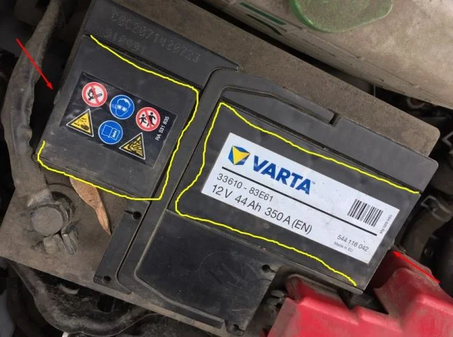 Аккумулятор получается не обслуживаемый. Можно попробовать поддеть две крышки указанные желтым, под ней могут быть пробки, если крышки не будут поддаваться, то не трогайте. Через отверстия указанные красными стрелками при зарядке будут выходить возможные испарения (это «вентиляция»). Заряжайте аккумулятор током не более 1/10 от емкости, т.е. 4,4А, не более 10 часов, если начнется бурление внутри аккумулятора, то прекратите зарядку.