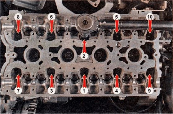 Устанавливаем в отверстия головки болты ее крепления. Динамометрическим ключом затягиваем болты крепления головки в три приема — сначала моментом 20 Нм (2 кгс-м), затем доворачиваем болты на 90° и потом еще раз доворачиваем болты на 90°. При этом соблюдаем очередность, указанную на фото(см. выше).