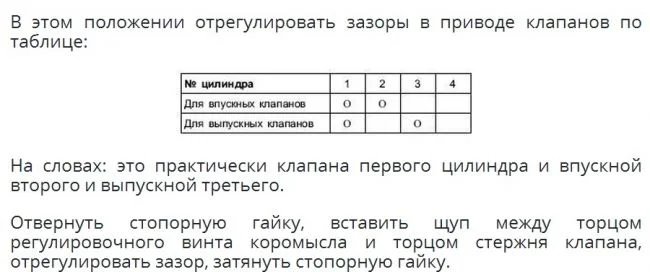 Повернуть коленвал ровно на 1 оборот, по направлению вращения и отрегулировать остальные зазоры по таблице: